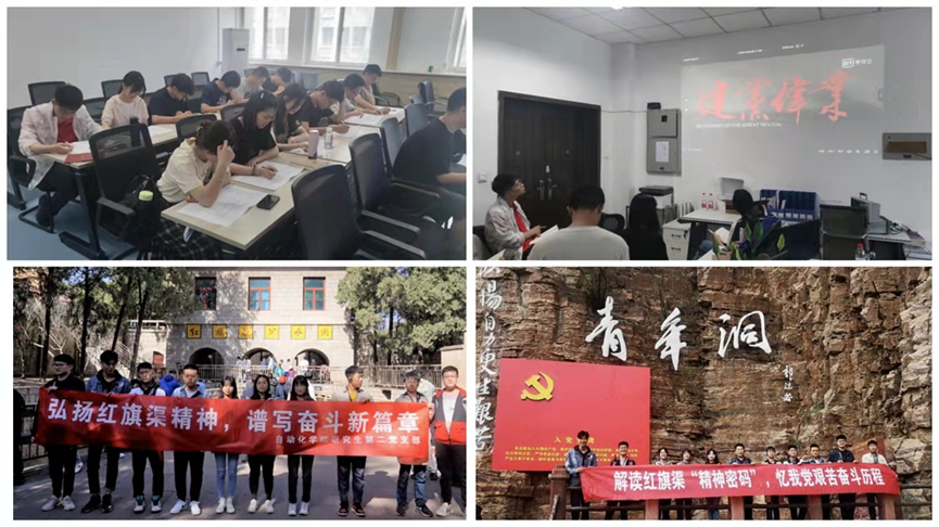 支部将党员教育与各类主题教育及主题活动相结合,广泛开展了交流分享、学习讨论、阅读原著、专题党课、研讨交流、集体观影、实践活动等一系列活动,在学理阐释中增强政治认同。为深入学习贯彻习近平总书记在党史学习教育动员大会上重要讲话精神,支部定期举办“党史知识测试”,深化党员对党史的认知,以测促学、以考验学、以学促知、以学促行,激发党员学习积极性,进一步促进了党员对党的理论知识的学习和理解;支部承办学院“人人讲党史”活动,形成了稳定的宣讲团队,营造了浓厚的活动氛围,并在学院公众号上发表相关文章进行宣传,做到以讲促学、以讲促思,有效推动党史学习教育走深走实;依托学院的党建“领航行动”计划,党支部成员赴河南红旗渠开展了为期两天的“传承红色记忆,弘扬红旗渠精神”实践活动,通过专题讲座、实践教学等多种形式帮助学生党员深刻领悟了“自力更生、艰苦创业、团结协作、无私奉献”的红旗渠精神。为进一步促进学生党员对党的理论知识的学习和理解,发挥党员先锋模范作用,支部建立“党员先锋角”,方便支部同志开展交流研讨,集体观影等活动。在暑假期间,组织党员前往广西桂林、贵州遵义、陕西延安等地开展红色教育活动,进一步加强党员教育实效性。